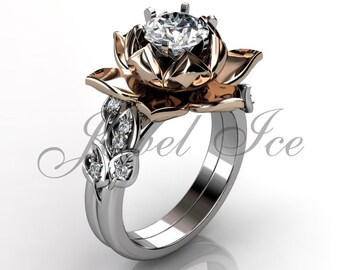 Set De Fiancailles Fleur De Lotus 14k Or Rose Diamant Unique Etsy